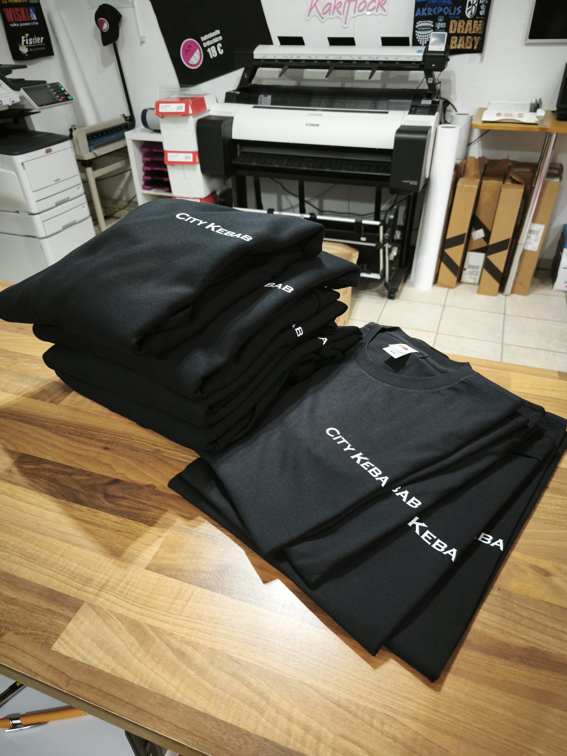 Heute durften wir wieder ein tolles lokales Unternehmen unterstützen: Für City Kebab Kaltenkirchen haben wir eine neue Serie von Shirts bedruckt. - Technik: Wir haben uns für den langlebigen Logodruck mit hochwertiger Flexfolie entschieden, um eine strahlende Optik und hohe Waschbeständigkeit zu gewährleisten.