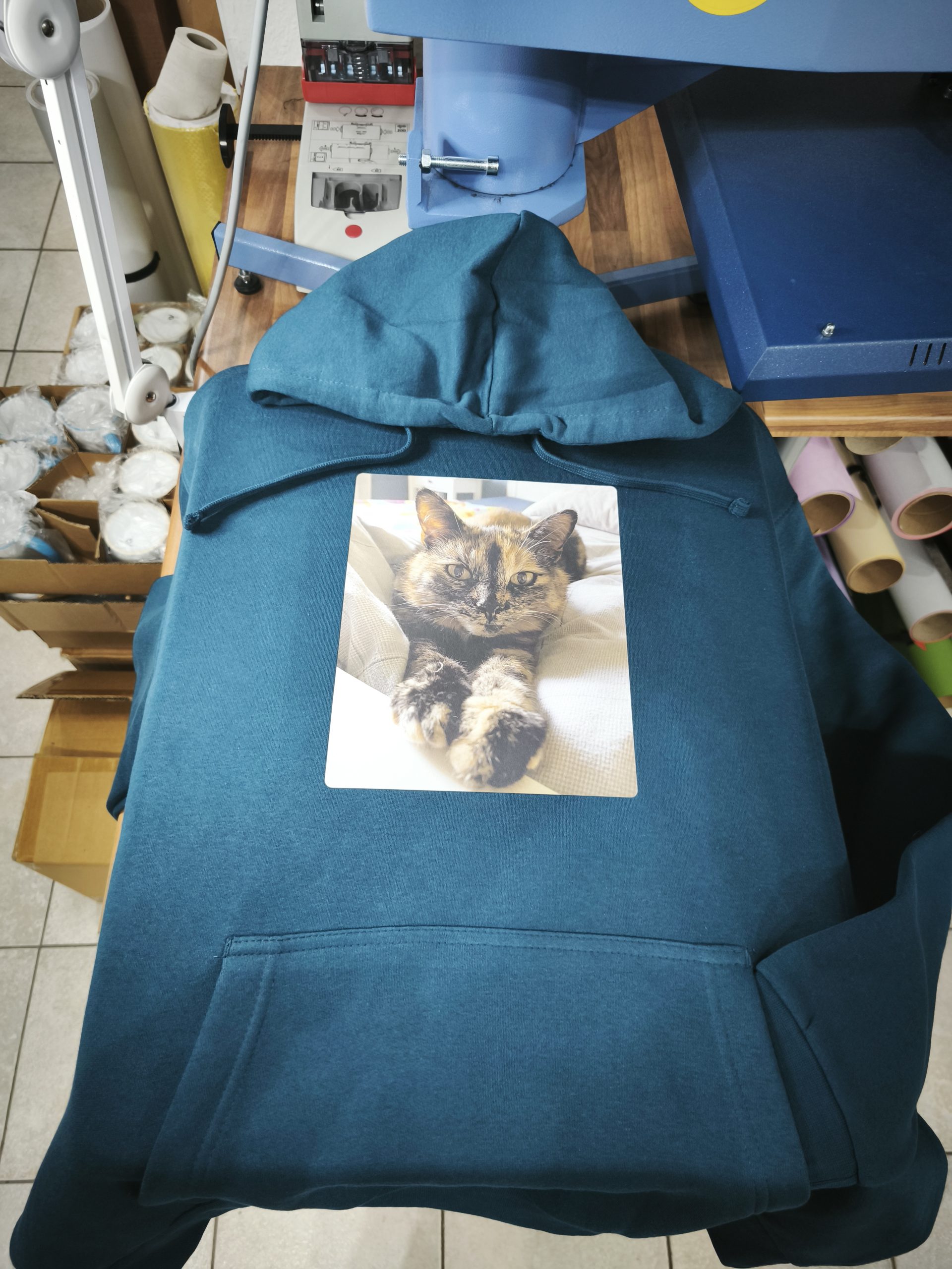 Ob Hoodie, T-Shirt, Pulli oder Polo â bei uns bekommst du hochwertige Textilien mit deinem persönlichen Haustiermotiv. Wir drucken dein Foto im Eco-Solvent-Druck, einem besonders farbstarken, langlebigen und umweltfreundlichen Druckverfahren. Dadurch wirken deine Prints brilliant, detailreich und bleiben auch nach vielen WĂ€schen âlong-lastingâ.